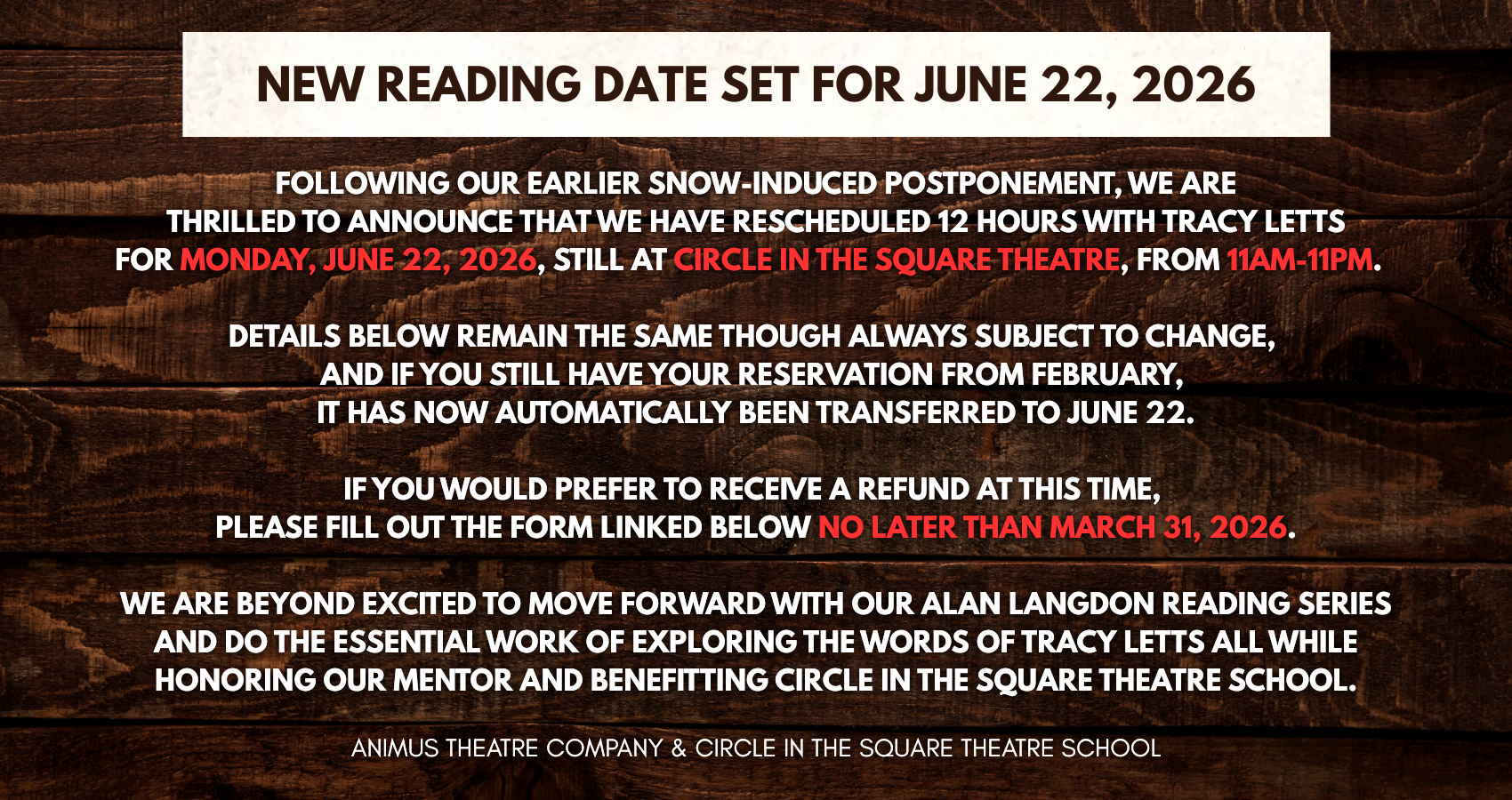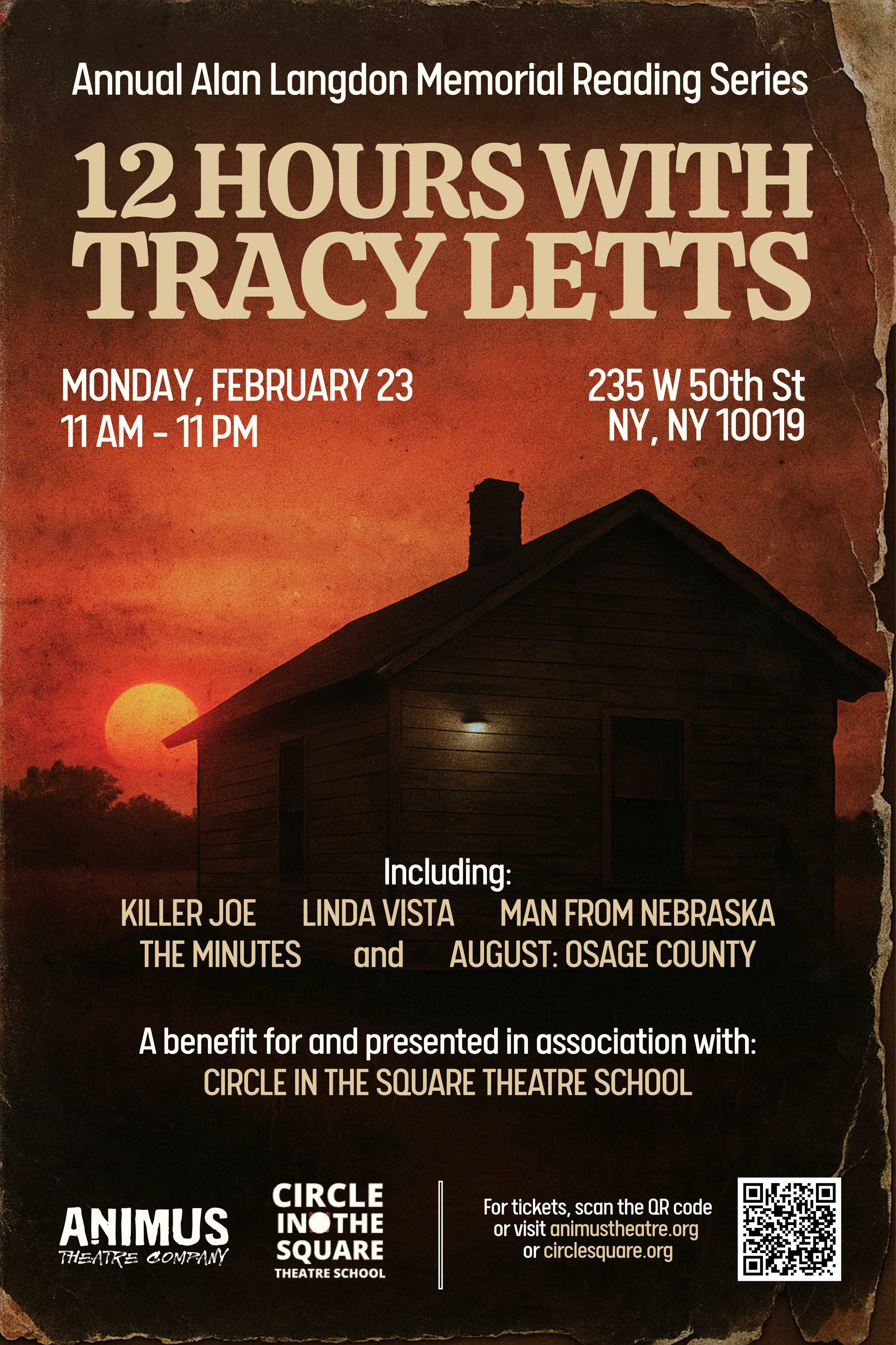 The Langdon 12-Hour Festival is intended to give audiences an opportunity to view multiple play readings connected via one writer in a marathon setting. The event is structured with the mission of being an affordable day of art for audiences and a benefit for Circle in the Square Theatre School, combining the linked works of one of the industry’s finest writers with many of its brightest stars of stage and screen, all read in a Broadway theatre.
